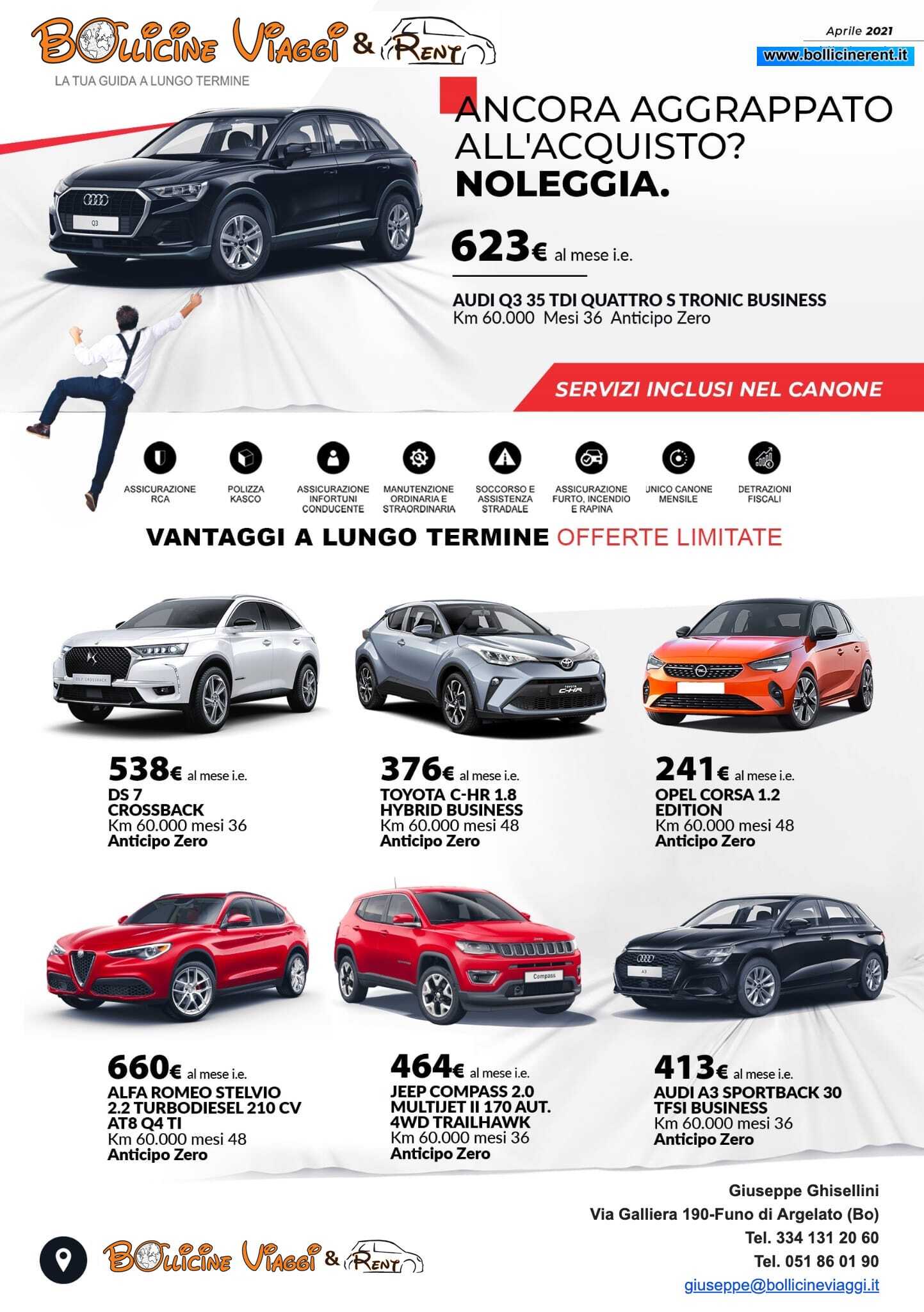 Nel noleggio, sono compresi diversi servizi: voi pagherete una quota mensile, stabilita con Bollicine Rent e... basta. Sì, avete capito bene: ogni spesa relativa alla vostra auto, eccetto, ovviamente, la benzina è a carico di Bollicine Rent.